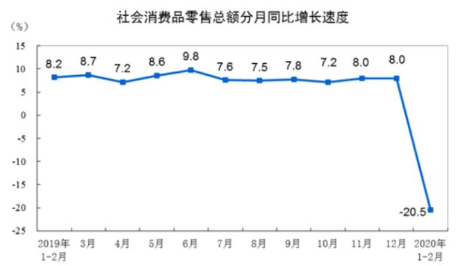 其中,消費(fèi)方面,1-2月份,社會消費(fèi)品零售總額52130億元,同比下降20.5%。