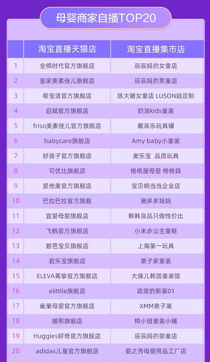 在母嬰領(lǐng)域,各品牌也在大力布局直播,據(jù)淘寶公開數(shù)據(jù),6月1日~6月18日母嬰商家自播TOP榜,幫寶適、babycare、好孩子、可優(yōu)比、愛他美、巴拉巴拉、好奇、Adidas等品牌的天貓官方旗艦店紛紛登榜。上榜母嬰親子TOP榜的品牌,在直播上也同樣表現(xiàn)優(yōu)秀。此次618大戰(zhàn)中,直播功不可沒,已經(jīng)成為商家業(yè)績?cè)鲩L一大新動(dòng)力。