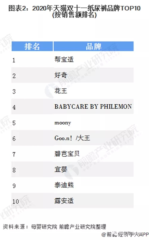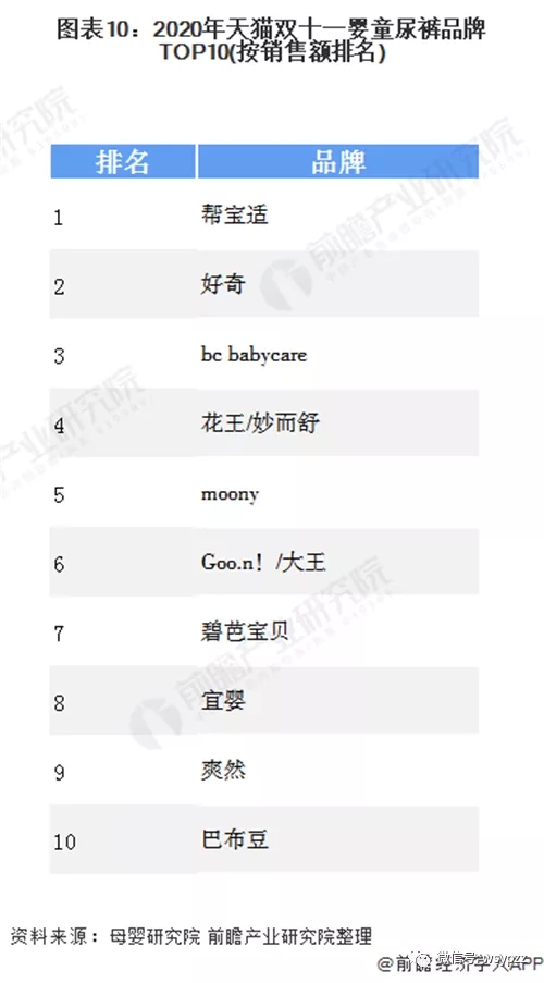 作為母嬰領域剛需、高頻的消費類目,紙尿褲需求量巨大,由于父母對于嬰幼兒健康愈發(fā)重視,消費者對于紙尿褲的品牌同樣重視。2020年天貓雙十一嬰童尿褲品牌TOP10中,幫寶適毫不疑問依然位居首位。