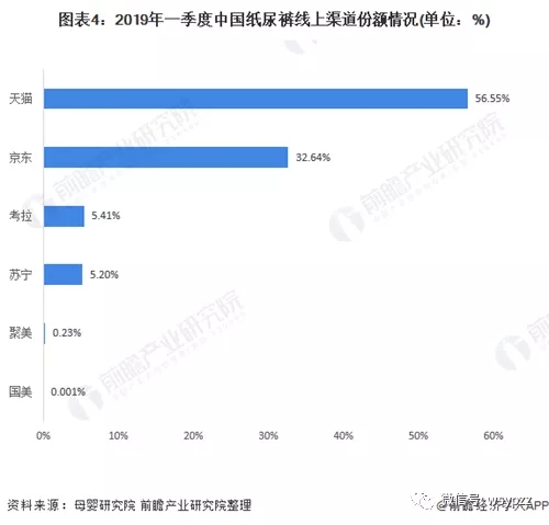 可見,線上渠道是紙尿褲銷售的重要渠道。2019年第一季度,紙尿褲銷售額達48.1億元,同比增長12.6%。其中天貓平臺保持其“一哥”優(yōu)勢,銷售額27.2億元,占比56.5%。京東平臺銷售額15.7億元,占比32.6%,同比增長6.1%。在增長率上,考拉出現了20.2%的負增長,蘇寧實現了214.8%的超高速增長。