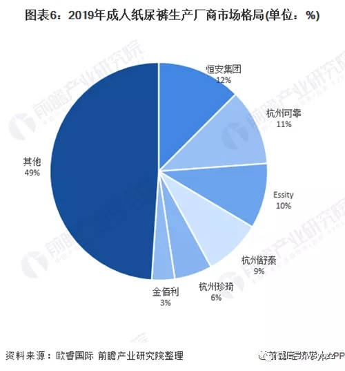 在成人紙尿褲生產廠商中,恒安集團、杭州可靠、Essity市場份額超過10%。排名前六的成人紙尿褲生產廠商市場份額為51.04%,市場集中度相對較高,生產廠商之間市場份額沒有拉開明顯的差距,市場競爭相對激烈。