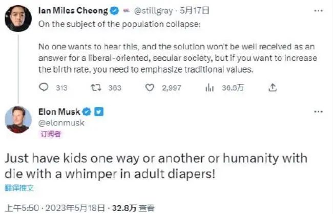 據(jù)財(cái)聯(lián)社報道,馬斯克近兩年頻繁就全球人口減少的問題多次發(fā)出警告,日前他又再度“催生”。馬斯克在一則推文中強(qiáng)調(diào)在出生率下降的情況下迫切需要采取行動,以及若不作為,人類未來所面臨的潛在后果。#馬斯克再敲人口警鐘#
