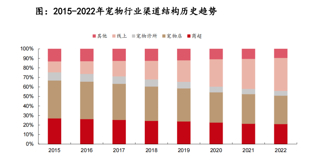 從渠道端來看,隨著電商平臺的高速發(fā)展,寵物用品銷售渠道線上化強勢。寵物用具銷售渠道豐富,線下銷售渠道可細分為商超、寵物店、寵物醫(yī)院診所等渠道,