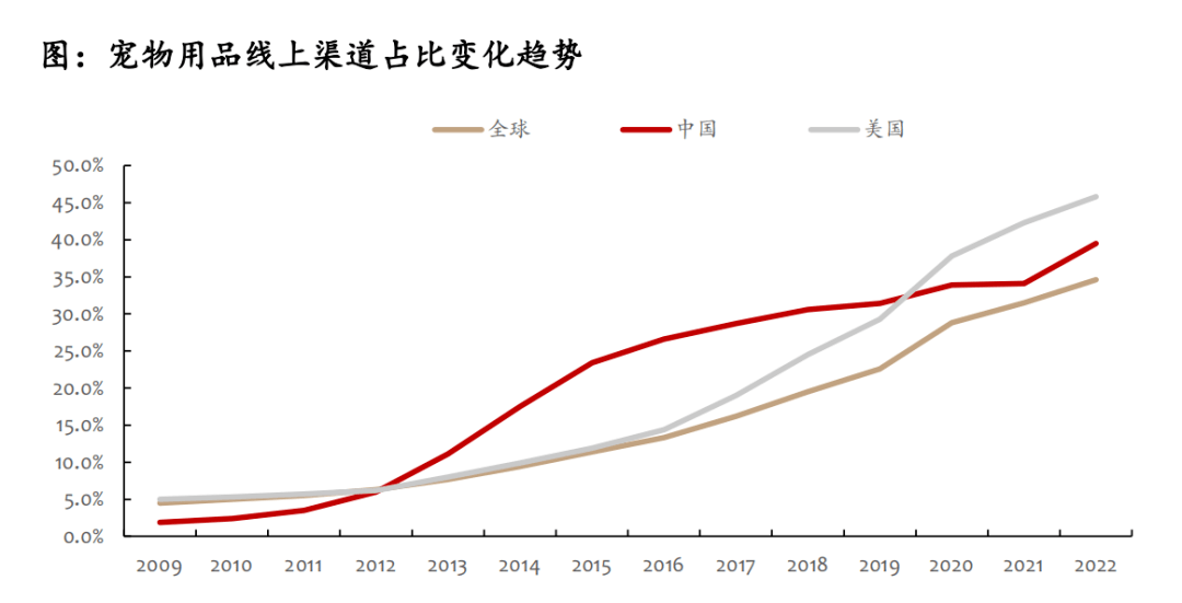 隨著電商平臺的迅猛發(fā)展以及線上購物的便捷性,寵物用品線下銷售渠道占比有所下降,而線上渠道占比持續(xù)提升。根據(jù)歐睿國際的數(shù)據(jù)顯示,全球?qū)櫸镉闷肪€上渠道占比由2013年的7.7%增長至2022年的34.6%,13-22年規(guī)模CAGR高達18.17%。