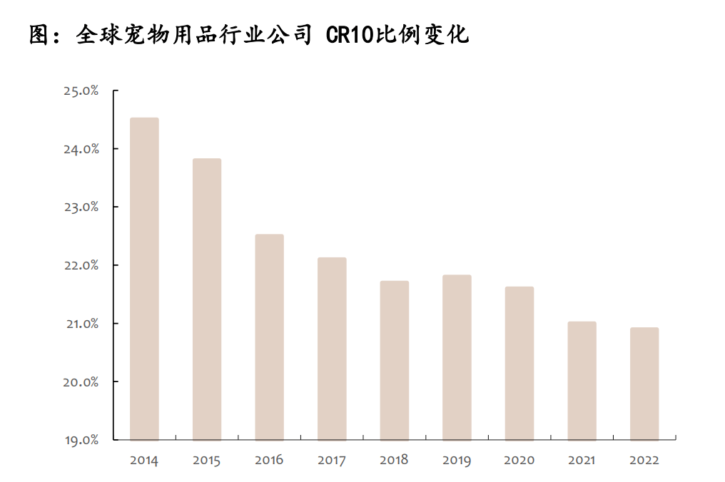 根據(jù)歐睿國際的數(shù)據(jù),從公司層面來看,2022年全球?qū)櫸镉镁逤R10(最大的10個寵物用品公司之和所占的比例)僅為20.9%,2021年CR10為21.0%,而2015年CR10為23.8%,整體來看全球?qū)櫸镉闷沸袠I(yè)公司CR10呈下降趨勢;2022年CR3僅為9.9%,市場份額top3分別為Central Garden& PetCo、Nestle SA、ElancoAnimal Health Inc,市場份額分別為3.6%、3.4%、2.9%。