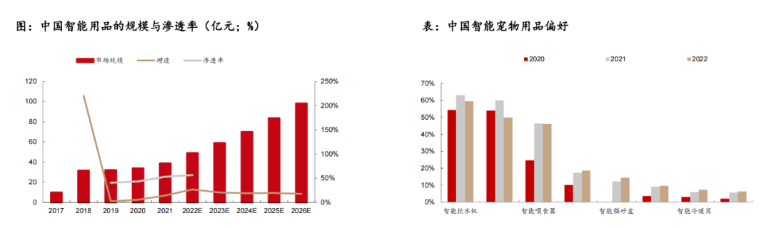 一是智能化:數(shù)據(jù)顯示,2017-2021年中國寵物用品市場規(guī)模分別為9.8、31.4、32.1、33.8、38.6億元,2017-2019年CAGR高達40.9%,預計到2026年,寵物智能用品有望達到98.1億元。