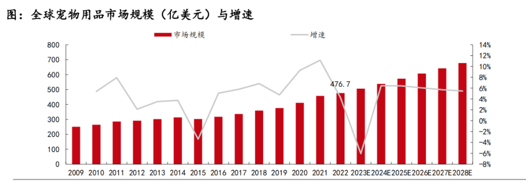 根據(jù)歐睿國際數(shù)據(jù)顯示,2019-2021年寵物用品市場增速分別為4.76%、9.28%、11.16%。2022年增速有所放緩,僅為4.28%,全球?qū)櫸镉闷芬?guī)模達477.68億美元,2019-2022年復合增長率為8.20%,預計2022-2028年寵物用品復合年均增長率為3.03%,寵物用品市場規(guī)模將達到677.25億美元。
